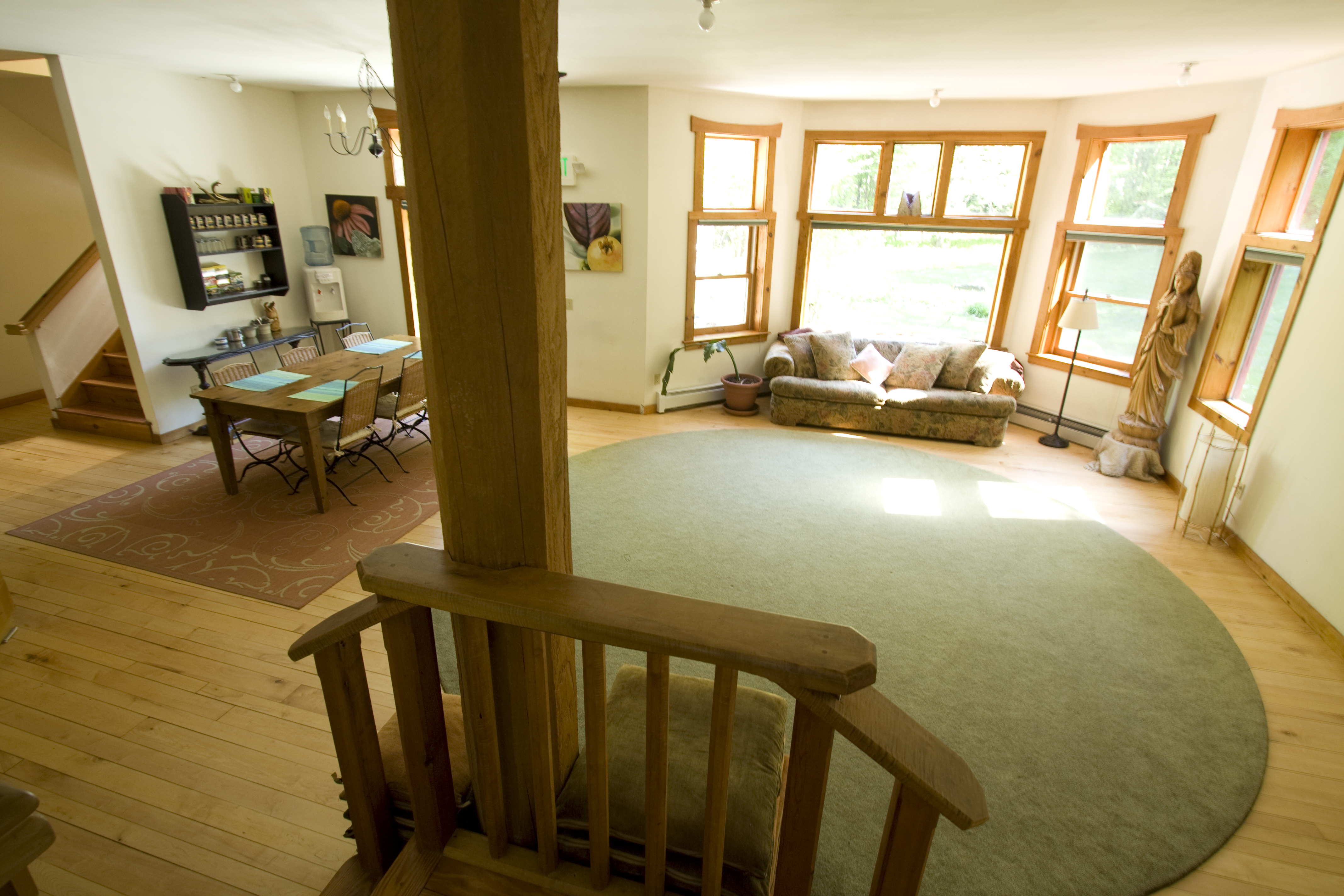 The Great Room on our first floor is an open, light-filled meeting and work space. We can supply cozy couches for lounging, tables and chairs, flipcharts and projectors for meetings, yoga mats and cushions for yoga classes, back-jacks for meditation or leave the room wide open for activity. Just let us know! This spaces fits about 6 massage tables, 8 Thai massage mats, 10-12 breathwork mats, 15-20 yoga mats, 25-30 back-jacks and 40 folding chairs. The adjacent dining room is conducive for more intimate conversation or meditation practice.